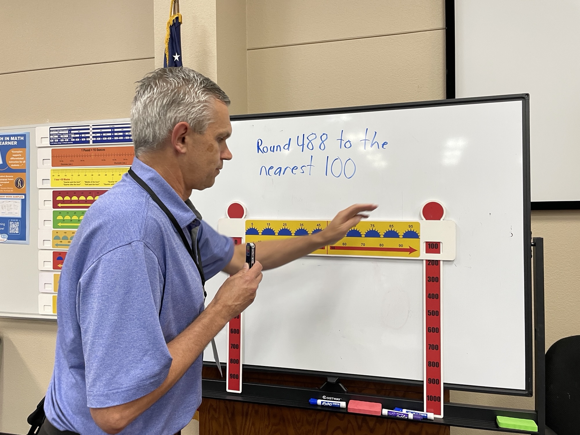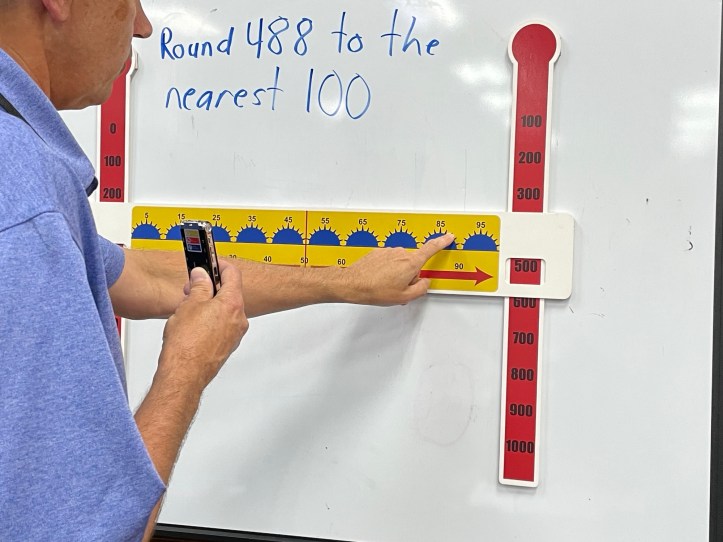 For example, to round 488 to the nearest 100, you would put 400 in the window on the left slide and 500 in the window on the right. Then, you look at the “88” part. You move to the number 80 and count up 8 lines. When I ask students how they know the answer is 500, they say their finger is closer to 500, 88 is greater than 50, and it’s to the right of the middle line.