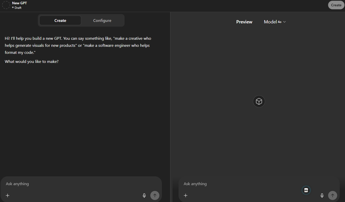 The Custom GPT Editor is pretty amazing. The first screen you will see is this one, the CREATE window: