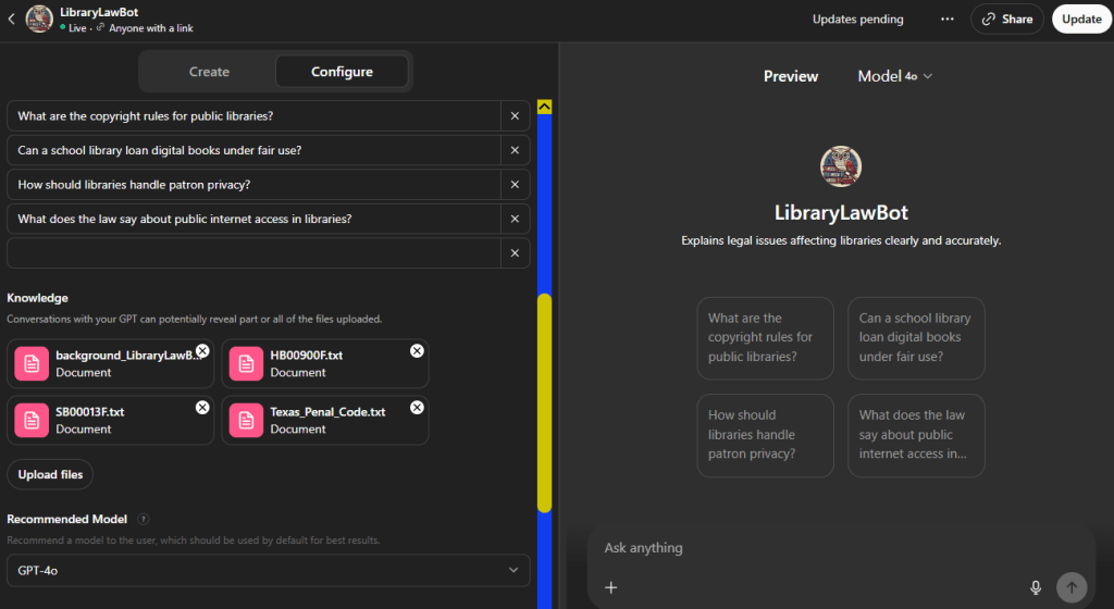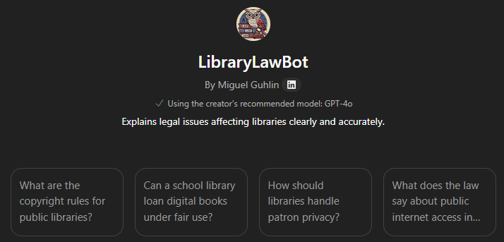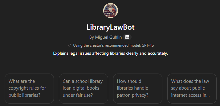 Here’s what that looks like using the Library Law Bot Custom GPT as an example: