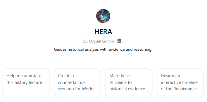 HERA (Historical Evidence & Reasoning Assistant) guides students and educators through a three-phase approach to historical analysis, transforming passive content consumption into active critical thinking and evidence-based reasoning with the help of AI tools.
