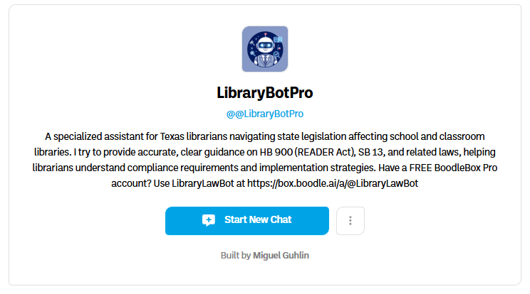 - Library Law Pro: An enhanced version of the Library Law Bot, providing specialized assistance for Texas librarians on library-related legislation. This is hosted via BoodleBox AI. Get a free two months account using the MGFREE123 code, or this referral link for one month in case the code expires. BoodleBox safeguards your data privacy, and is my personal recommendation for educators who don’t want to use ChatGPT, Claude, Gemini, Copilot because it uses what they put into the system for training.