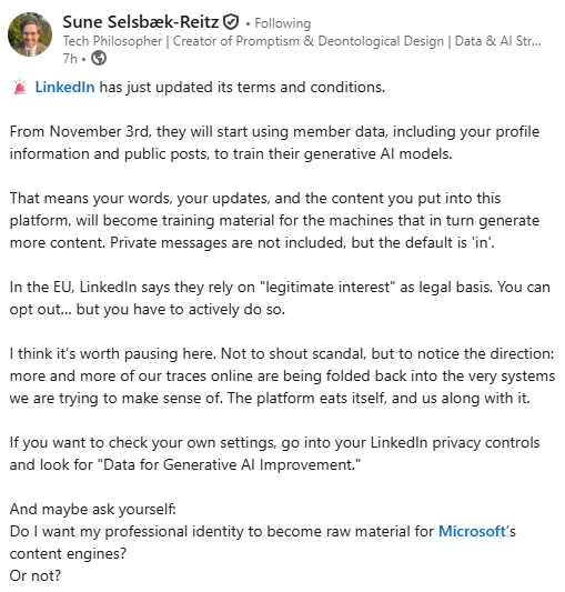 Like everyone else using LinkedIn today, when I logged in I encountered an update to the terms of service. I figured that it boiled down to them being able to use anything I put in for Gen AI training. This analysis from Sune Selsbaek-Reitz confirmed it: