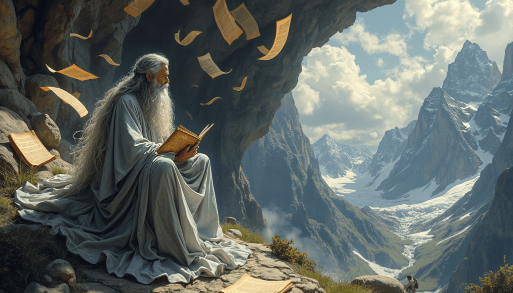 The pages rustled like autumn leaves as they escaped his weathered hands, dancing on the mountain wind before settling among the rocks. He didn’t chase them anymore. What was the point? The wisdom of ages, the prophecies of millennia—all rendered obsolete by silicon and code.