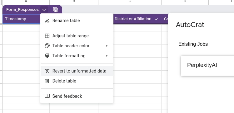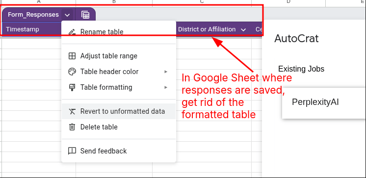 Once you link Google Form’s responses to a Sheet, make sure to go in and select the “Revert to unformatted data” BEFORE setting up the Autocrat job. This will take the “stall” out of the Autocrat New Job creation process.