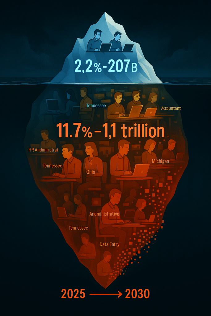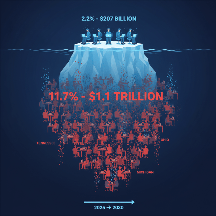 - Every state is affected, not just Silicon Valley – Tennessee, Ohio, and Michigan workers face MORE risk than California tech workers because of hidden office automation.