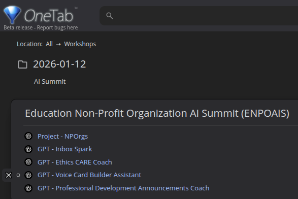 OneTab has long been one of my favorite in browser bookmark link tracker. This is in addition to it being free. It’s easy to share OneTab collections with QR codes, etc. Although Raindrop.io dethroned OneTab for general bookmark management, I still find OneTab a super helpful tool for managing ongoing Gen AI chats, Projects, or GPTs/Gems/Bots. What’s more, OneTab has upgraded its extension, giving it “groups” and “folders” which you can use to organize your links. OneTab has made it easy to move groups into folders, or vice versa (whatever works best for you).