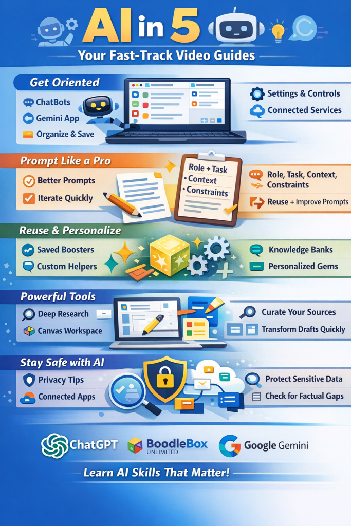 Wanting to learn how to use Generative AI tools like BoodleBox, ChatGPT, Gemini, and others? Be sure to follow the AI in 5 videos series. Each topic gets video tutorials highlighting key features. It’s great for beginners, as well as those who may need a refresher. These will become available via the TCEA Knowledge Boosters page.