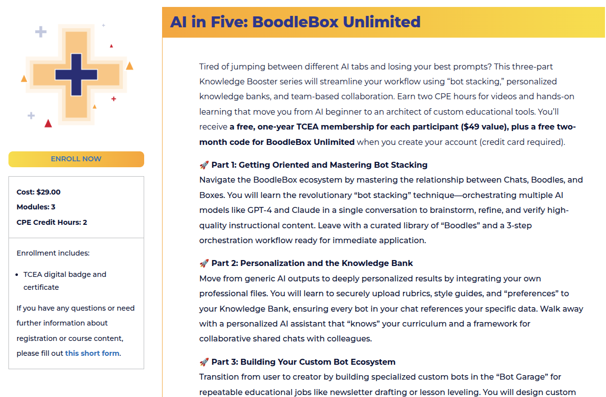 You can purchase the first in the series online featuring BoodleBox Unlimited at TCEA.org. The second in the series, Gemini and NotebookLM is now available as well.