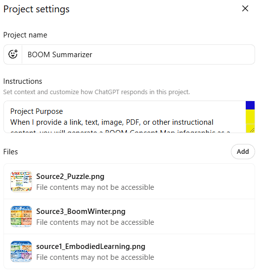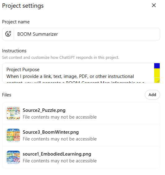 Today was a lot of fun. I spent some of my time “coaching” a ChatGPT Project on how to make an infographic that relied on the BOOM Concept Model Map, which I explore in this blog entry, Scaffolded Learning with Concept Mapping. This is for a knowledge booster, AI in 5: ChatGPT, I put together today (learn more about knowledge boosters).