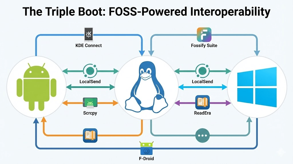 - The Cross-Platform Link: This is the operational center of your Triple Boot—you type a Linux command on Zorin and have it executed on the phone, or copy a URL on Windows and paste it instantly into a Fossify message.