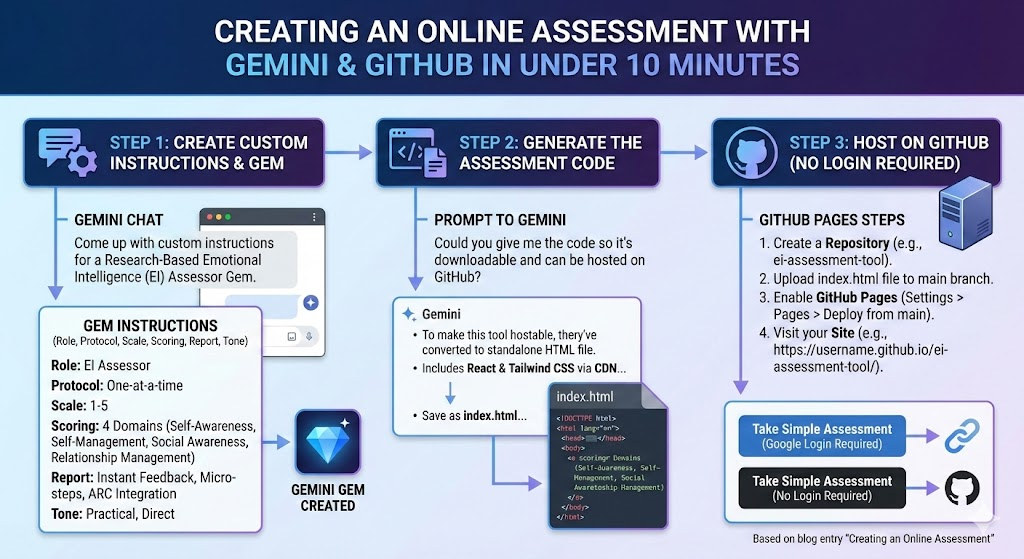 Earlier this week, someone asked me about an Emotional Intelligence assessment. I’d generated it a few months ago, but then had allowed it to lapse. It was never intended as something I was going to keep online. But since my colleague needed something, I wondered, “How hard would it be to create an online assessment using Gemini?”