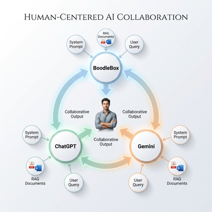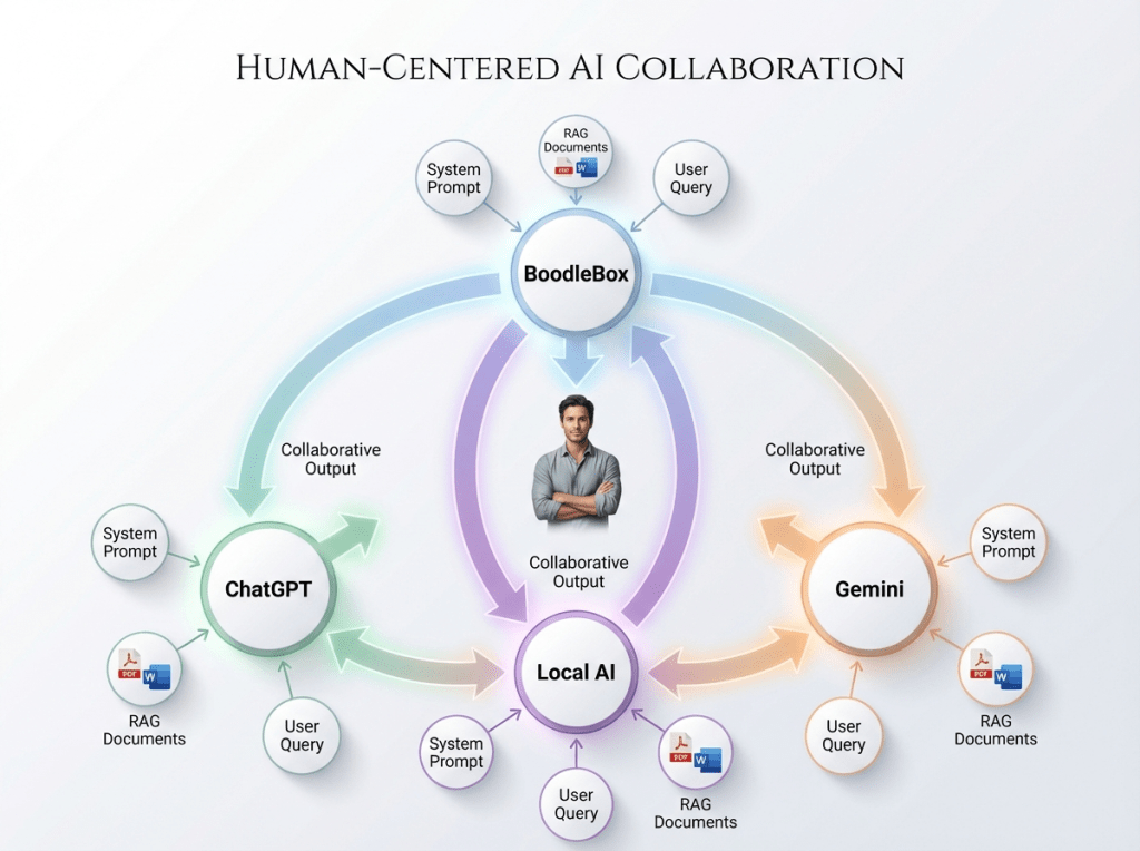 When preparing for workshops, etc. this process is what I often follow. The first LLM is usually ChatGPT Project, where it’s easy to gather a wide variety of documents. The next is Gemini Pro (v3), then I take the remainder and drop it into BoodleBox where I can use a variety of models a la bot stacking.