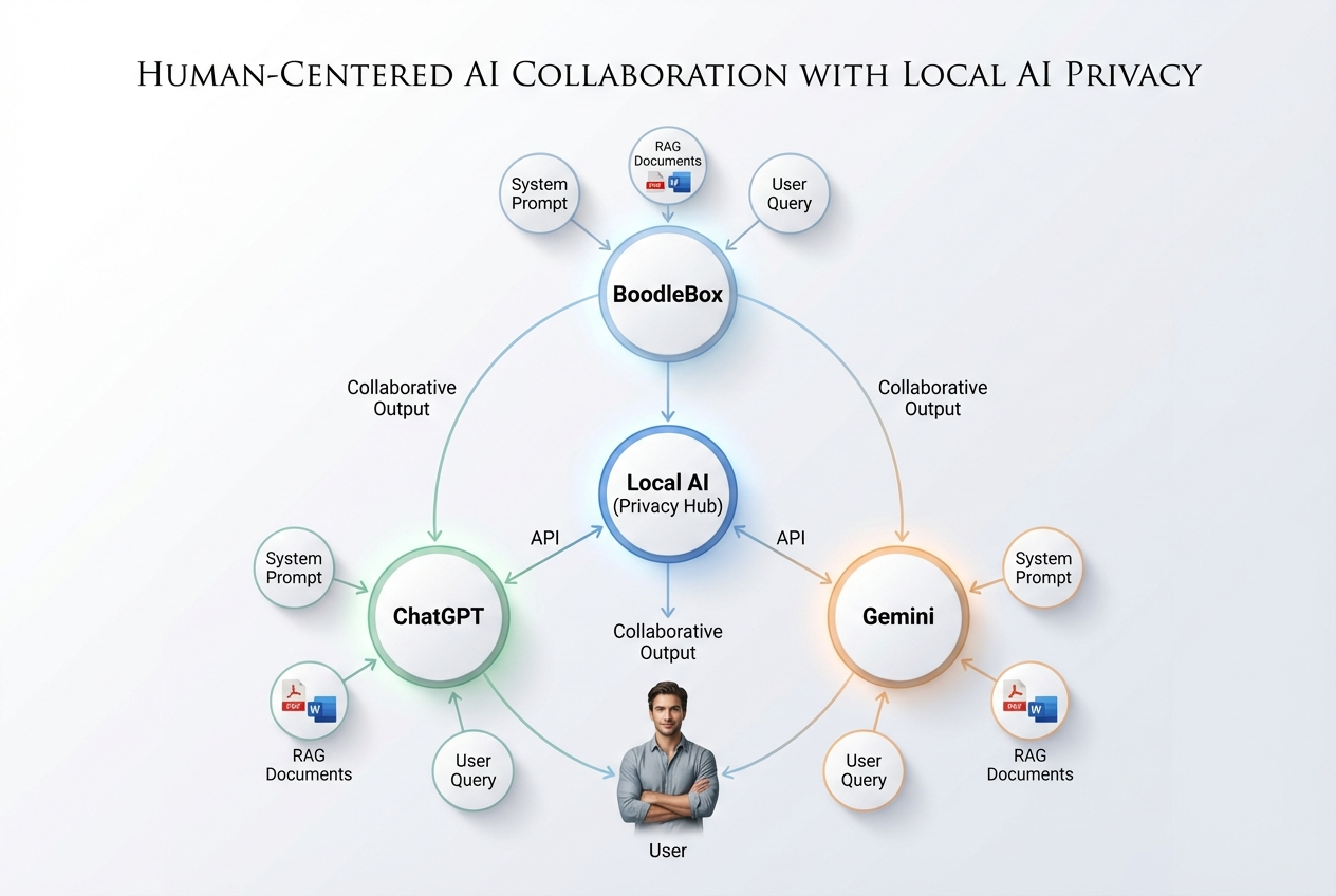 In this last diagram, I have the option of ChatGPT and Gemini, if I choose to pay for them via API. The benefit? My data is safeguarded and all the work happens on my device. If I need it, BoodleBox is available. The truth is that BoodleBox provides the value of all the LLMs for $20 a month. It’s worth the subscription, so long as I don’t need to use Gen AI on my smartphone for voice chat (which I really prefer but seldom use).