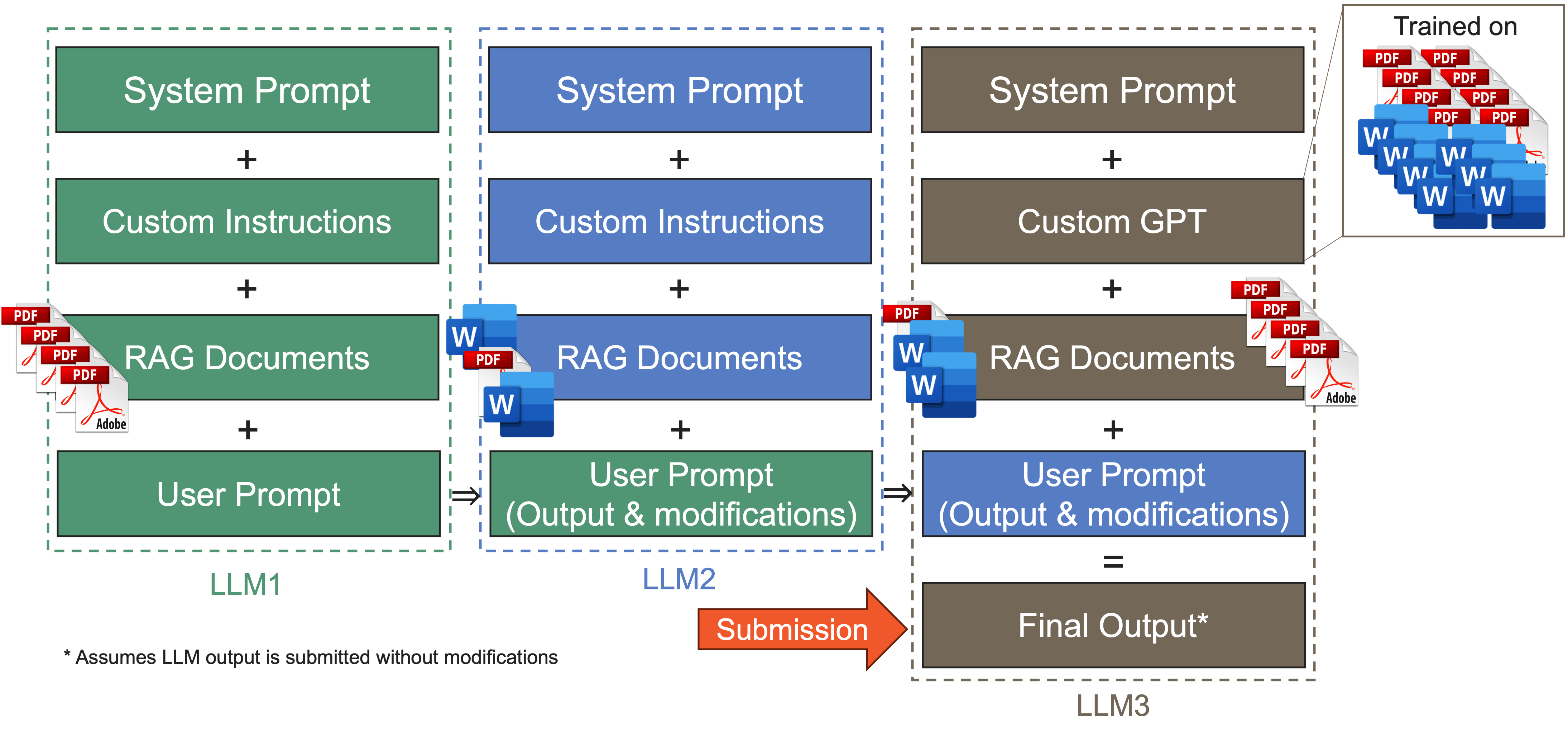 Professor Bassett’s perspective is that our current explanation of how students use AI is simple (and he offers a diagram that captures that). Instead, he proposes a second diagram that reflects the use of three different LLMs, and I found it to be quite reflective of my own processes in using LLMs. I love the simplicity of Bassett’s diagram and how it captures the multiple LLMs that someone might employ.