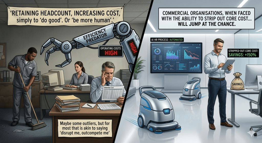 I simply cannot imagine any Organisation that will seriously argue that they must retain headcount, increase cost, simply to ‘do good’. Or ‘be more human’...if I have the opportunity to save money, or increase utility, using AI, I will do so without hesitation (source)