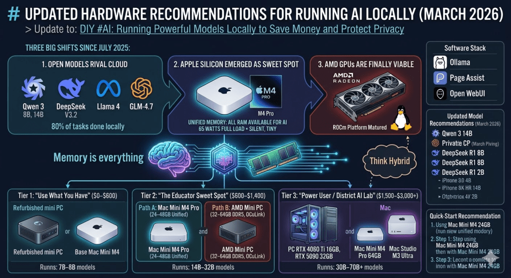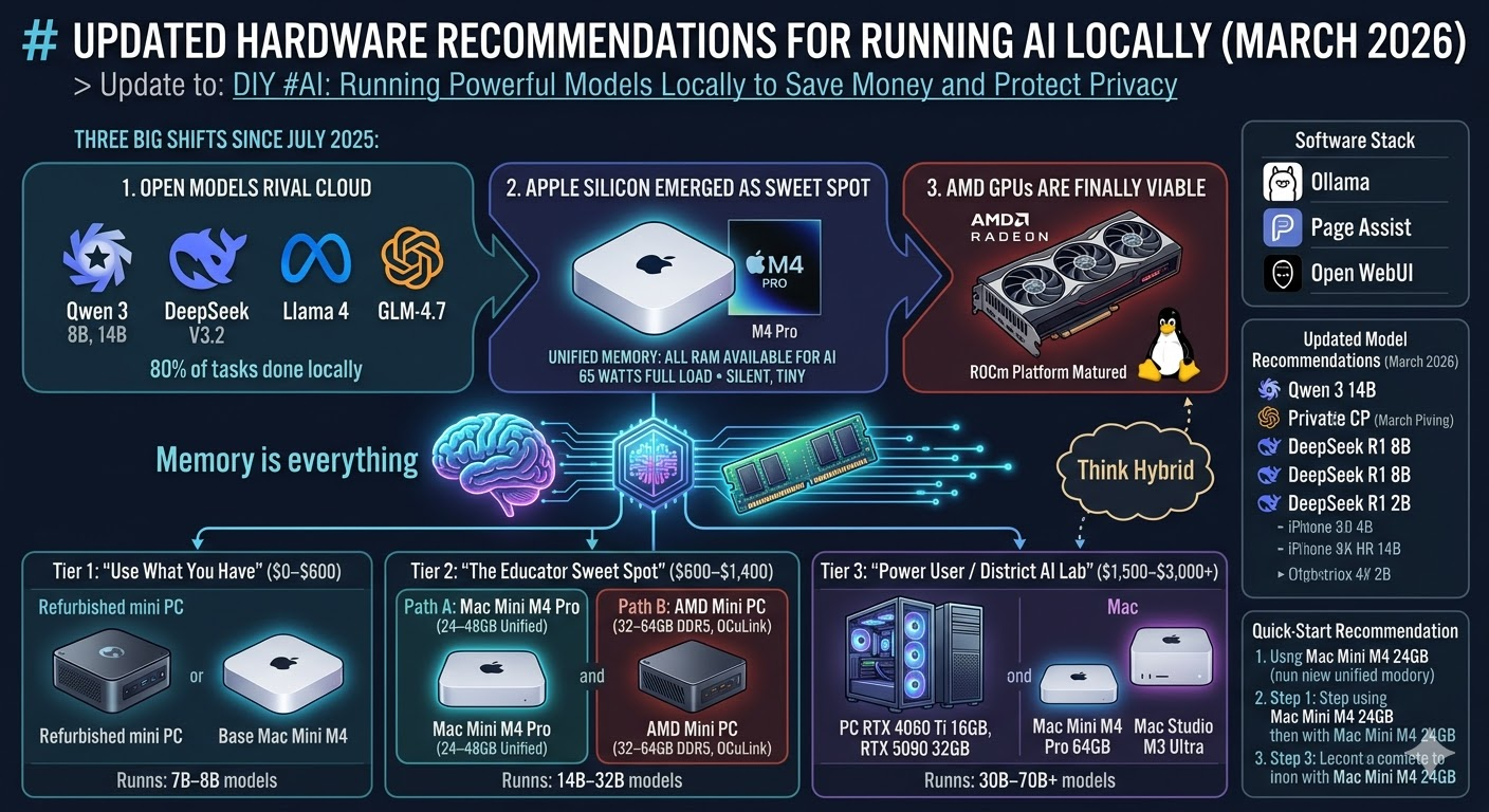 This post updates my July 2025 TCEA AI for Educators Conference presentation, DIY #AI: Running Powerful Models Locally to Save Money and Protect Privacy. The original session covered installing Ollama, Page Assist, and selecting models based on hardware constraints. The hardware and model recommendations above reflect the state of local AI as of March 2026.