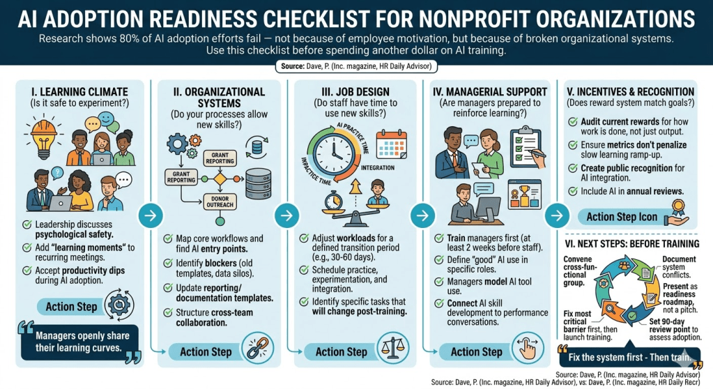 “80% of AI adoption efforts fail — not because of employee motivation, but because of broken organizational systems. Use this checklist before spending another dollar on AI training.”