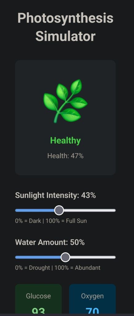 Create an interactive visual showing how photosynthesis works with sliders for sunlight intensity and water amount, displaying glucose/oxygen output and plant color changes.