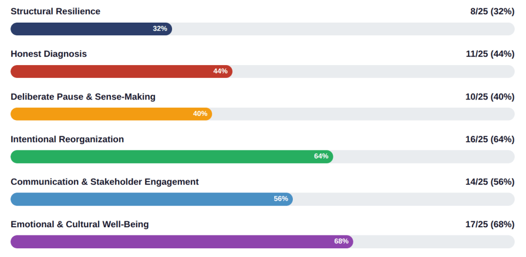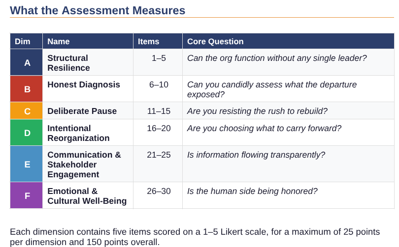 This is for anyone leading a group through the Navigating Leadership Transition self-assessment. The assessment tool is a 30-item, six-dimension instrument designed for nonprofit leadership teams, boards, and staff groups navigating a leadership departure. This guide provides session formats, facilitation prompts, interpretation support, and planning tools to make the assessment process productive and action-oriented.