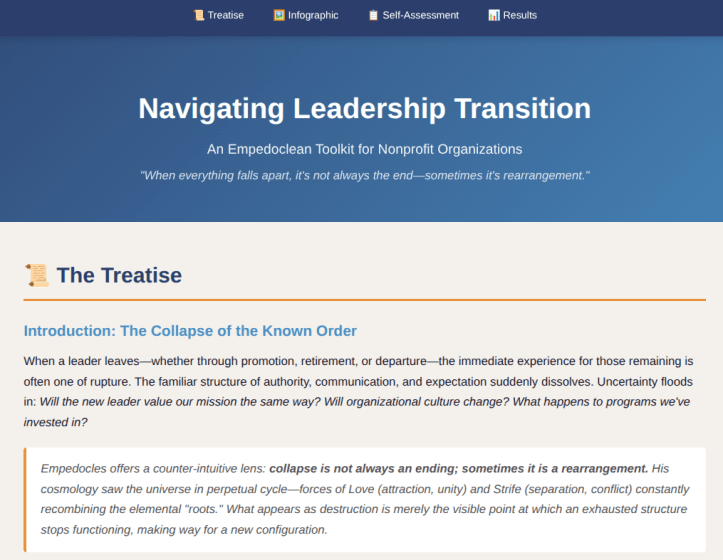 The underlying framework draws on Empedocles’ model of elemental rearrangement: leadership transitions are not simply losses but reorganizations of forces. The facilitator’s role is to hold that reframe for the group, even when the conversation gets uncomfortable.