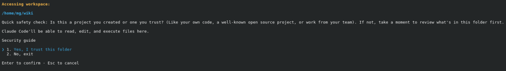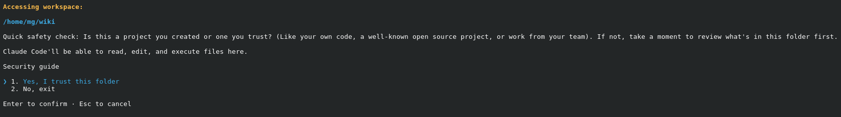 The next step was to set up the wiki folder and allow Claude access. I simply switched to my wiki folder at (cd ~/wiki) and then launched claude with > claude and there we go.
