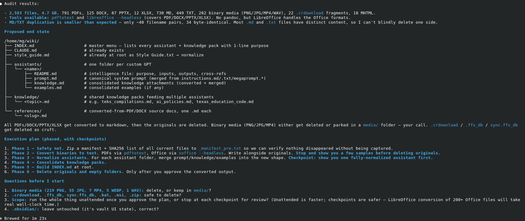 2. Literal replacement: delete the 80+ folders after summarizing. I’d push back on this; the summaries would lose the actual prompt text, knowledge attachments, and reference PDFs that the assistants depend on.