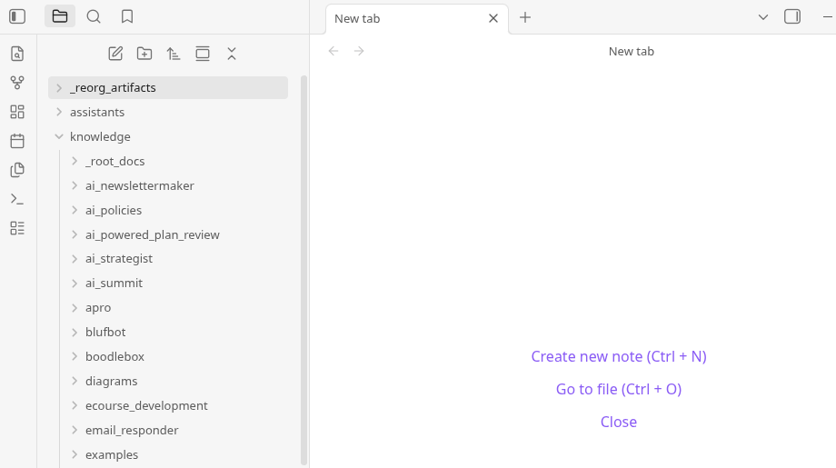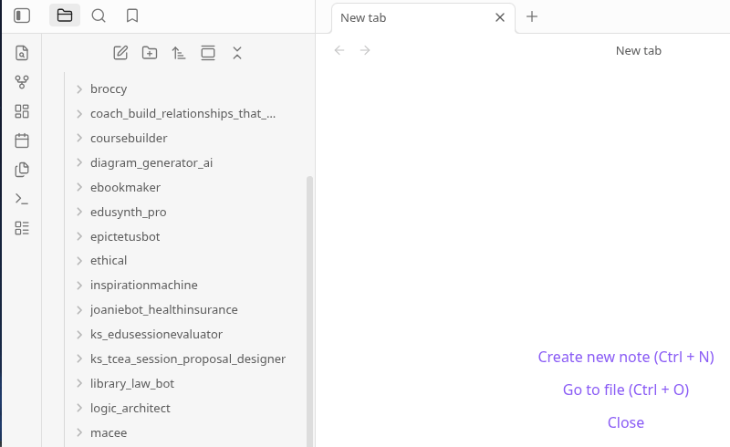 When I opened this in Obsidian, I was able to see the contents easily (of course, I could just open them via the file manager)…here are two screenshots of the assistants folder and knowledge folder: