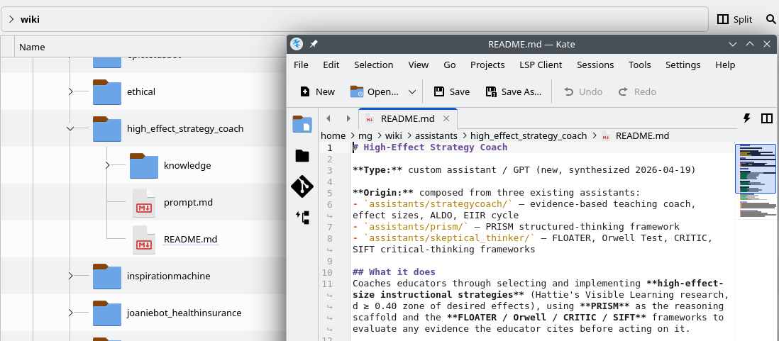 ● New assistant created at assistants/high_effect_strategy_coach/ with 14 curated knowledge files (420K total).