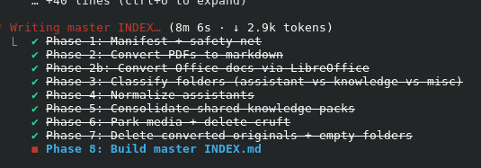 recap: Reorganized your wiki from 80+ flat folders (4.7GB, 2,583 files) into a clean assistants/knowledge/media layout with a master INDEX.md (1.9GB, 1,537 files). Next: open INDEX.md and spot-check a few