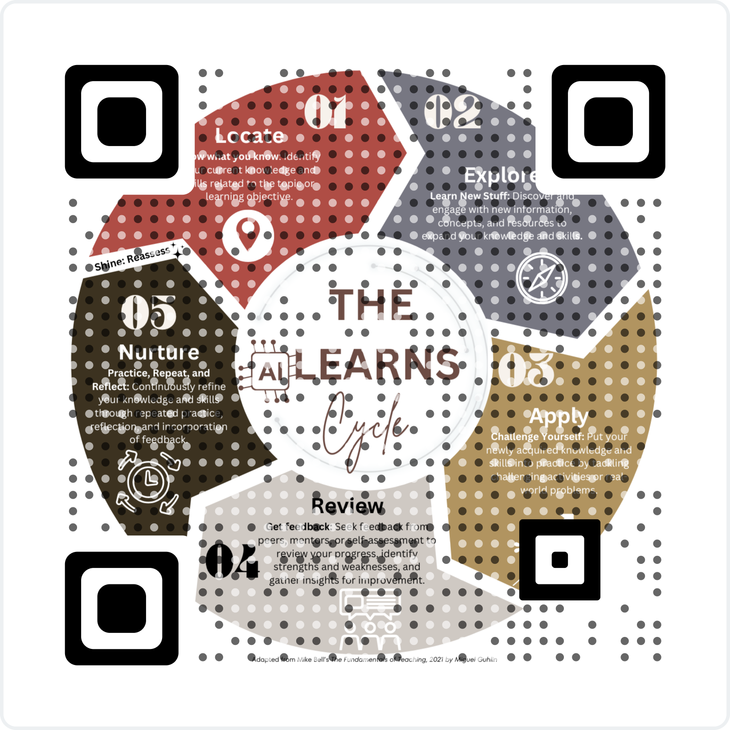 These tables provide you with a variety of sample prompts you can use in any chatbot, as well as AI Tool suggestions you can try. They align to the LEARNS Cycle, explained below. The LEARNS Cycle was adapted from Mike Bell’s work in The Fundamentals of Teaching but all errors/mistakes are my own. Be sure to explore his website for more details.